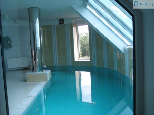 Zahrada, vnitřní bazén, terasa, 2 garáže, možné parkování pro více aut. Dům je rohový, polořadový, podsklepenný, cihlový, nízkonákladový.