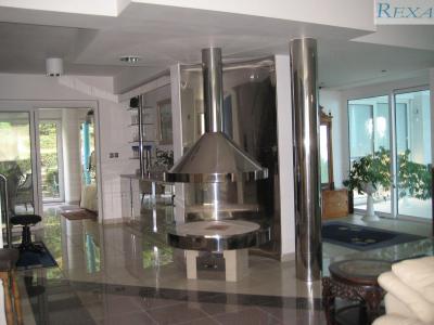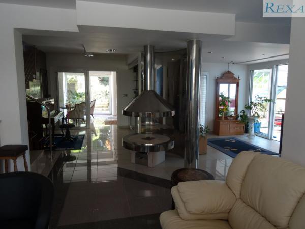 1NP: obývací pokoj/hala/ s vnitřním krbem z nerezu, ložnice se vstupem na zahradu, koupelna, vnitřní bazén, který je pokrytý podlahou s vytápěním a je využíván jako dětská herna. Sociální zázemí.