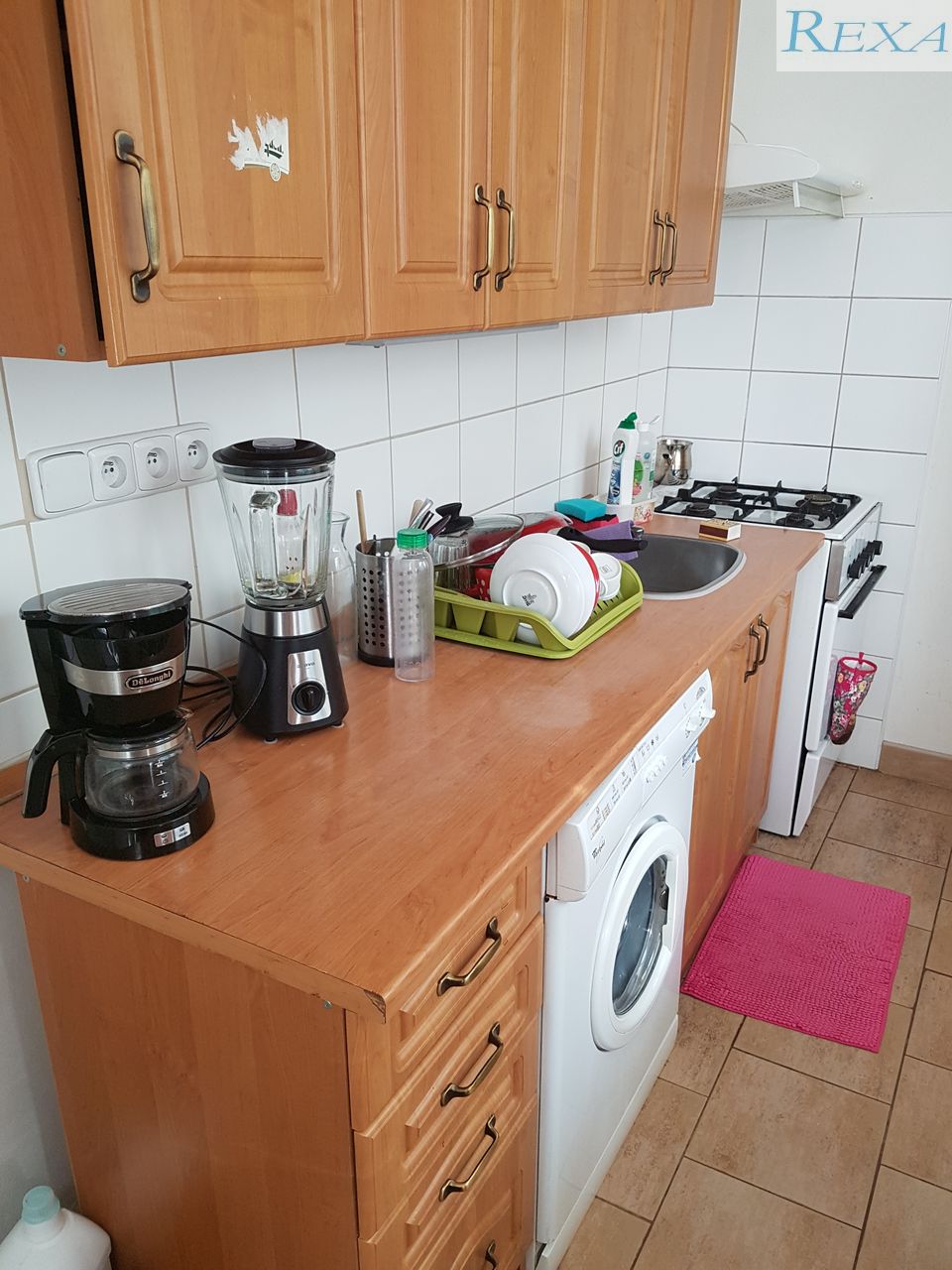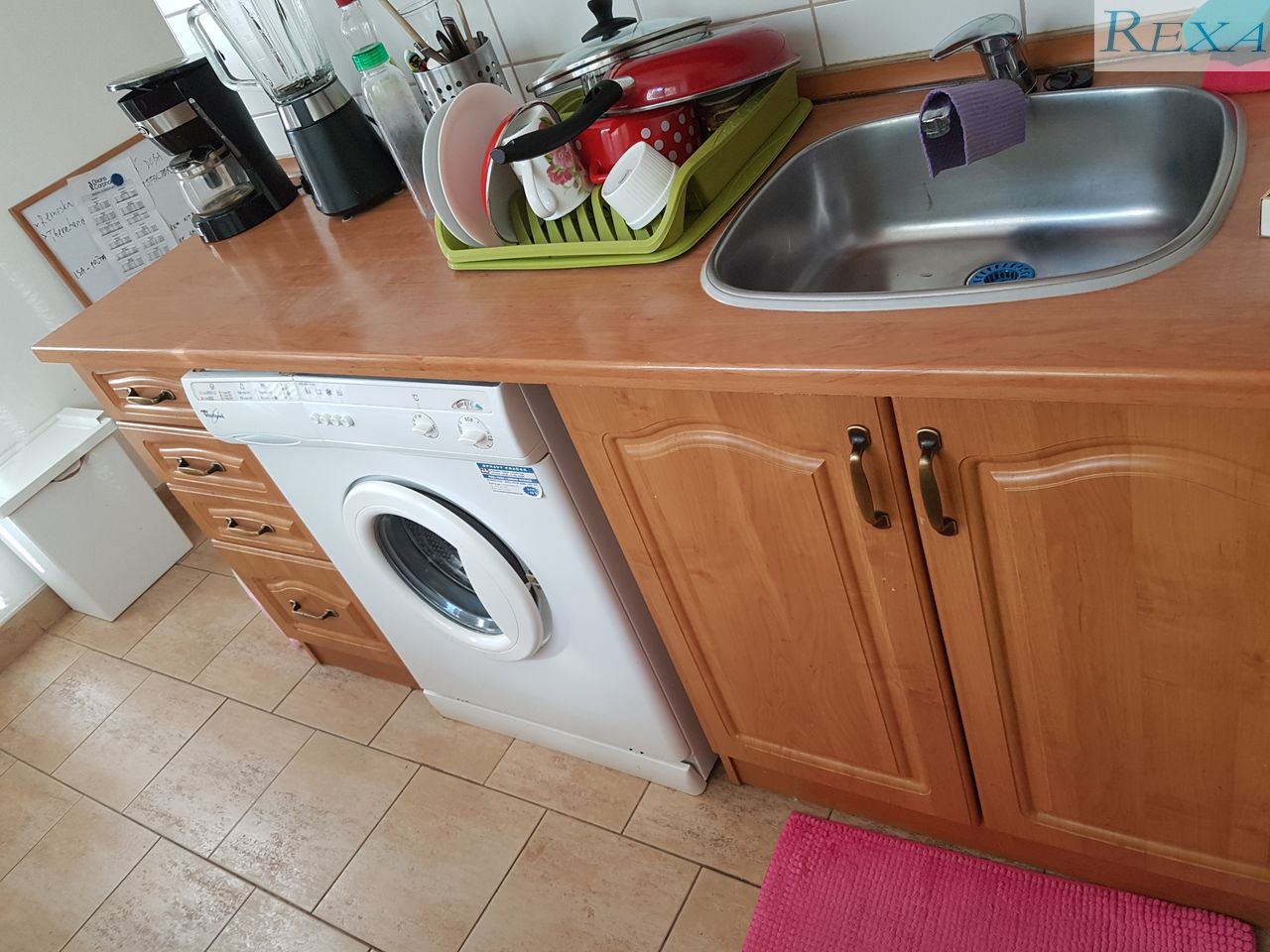 Koupelna, WC a kuchyň po rekonstrukci. Nová podlaha v obývacím pokoji. V druhém pokoji koberec.